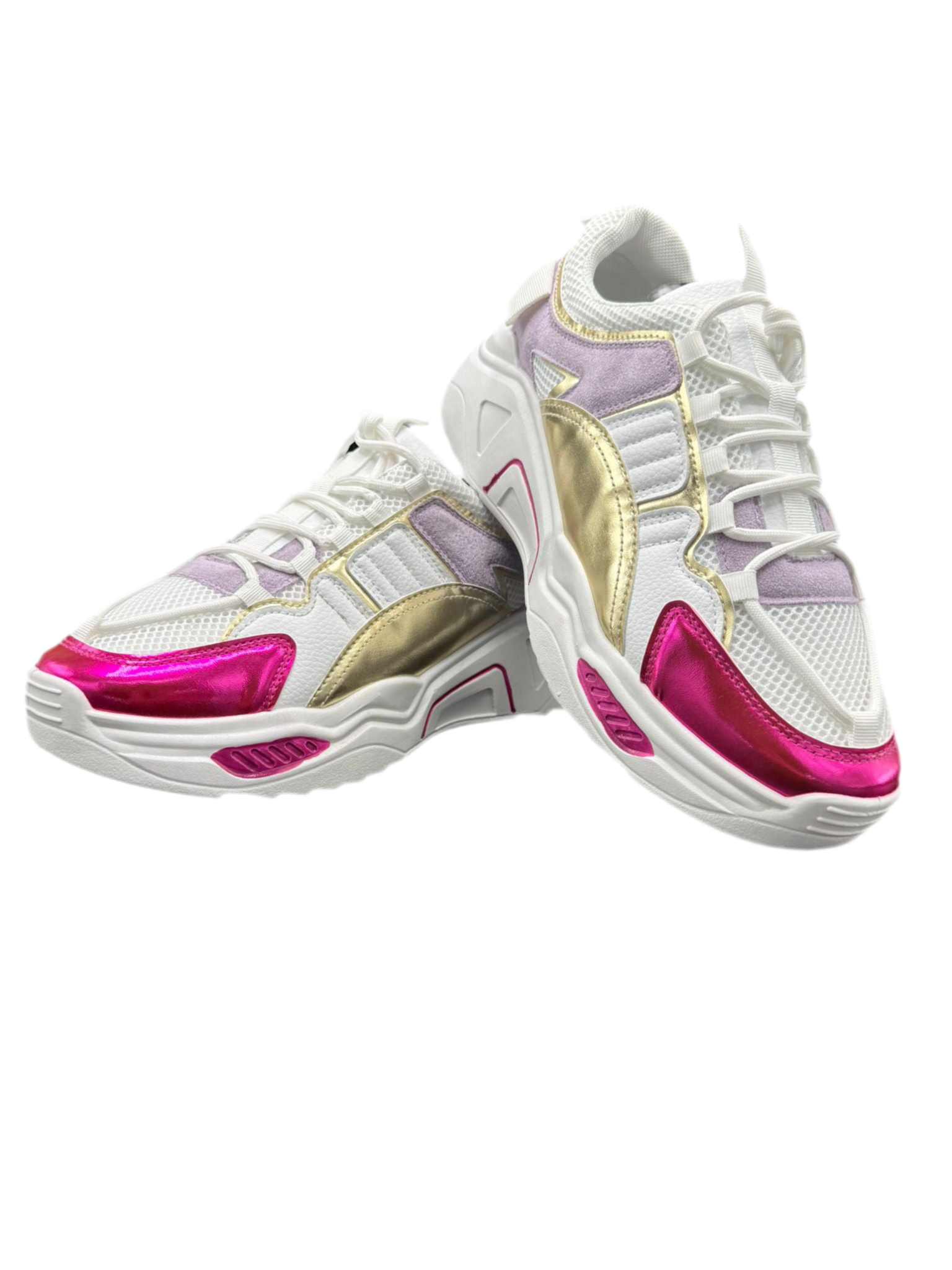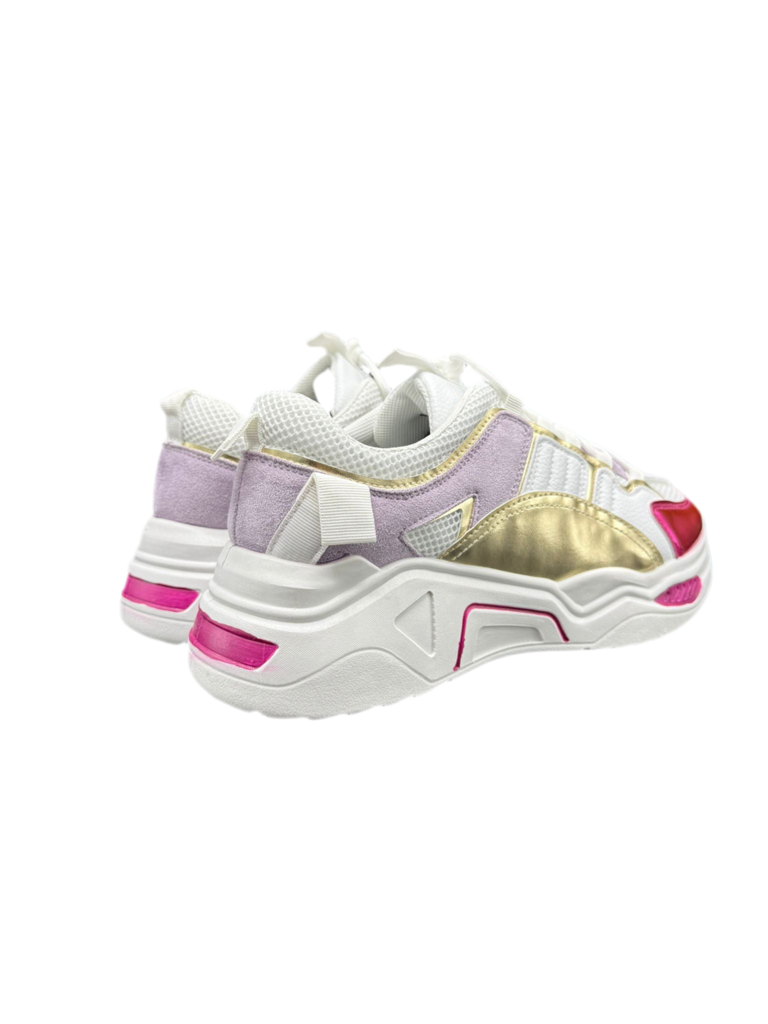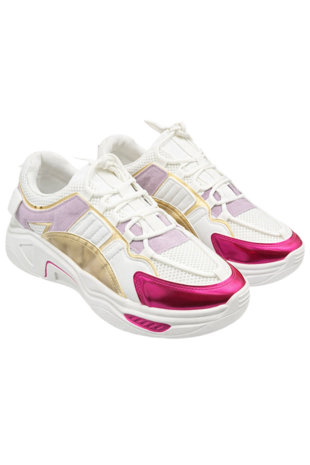 Deze sneaker is een echte eyecatcher. De combinatie van wit met paars- en roze metallic accenten zorgt voor een opvallende, trendy look die je outfit laat knallen.
